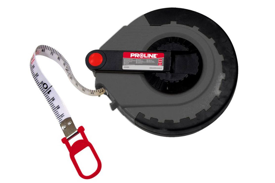 Měřící pásmo z pevněného skelného vlákna v plastovém uzavřeném zásobníku s kličkou.